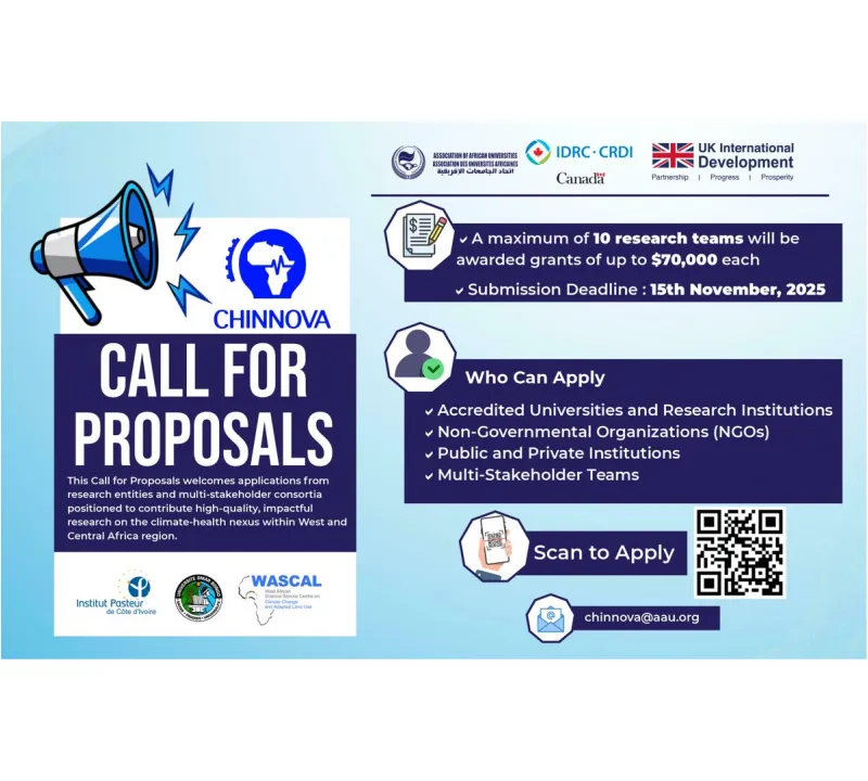 The Climate Change and Health Innovation Hub for West and Central Africa (CHINNOVA) is inviting proposals for its first Small Grants Call, dedicated to advancing locally led, interdisciplinary research and innovation aimed at tackling urgent climate-related health challenges across West and Central