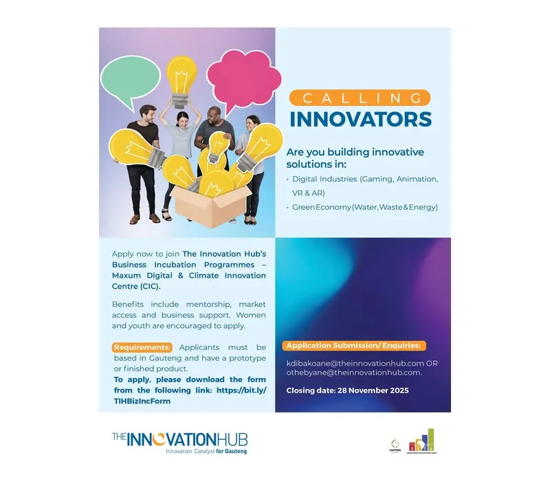 The Innovation Hub, Gauteng’s flagship innovation agency, is inviting applications for its comprehensive Business Incubation Programme for startups driving innovation in the Green Economy (energy, water, waste), Bio-economy (health, agro/food-processing, diagnostics, medical devices, smart