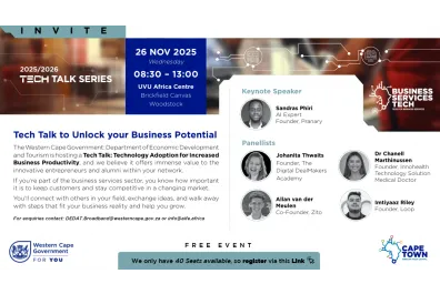 The Western Cape Government: Department of Economic Development and Tourism presents a high-impact Tech Talk on “Technology Adoption for Increased Business Productivity,” taking place on Wednesday, 26 November 2025 at the UVU Africa Centre, Brickfield Canvas, Woodstock, Cape Town.