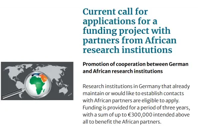 • Restrictions: Only one application may be submitted per applicant. Applications from African research institutions or German institutions that do not conduct research themselves (e.g., associations) cannot be considered.